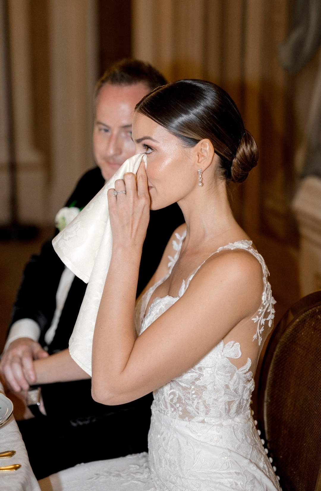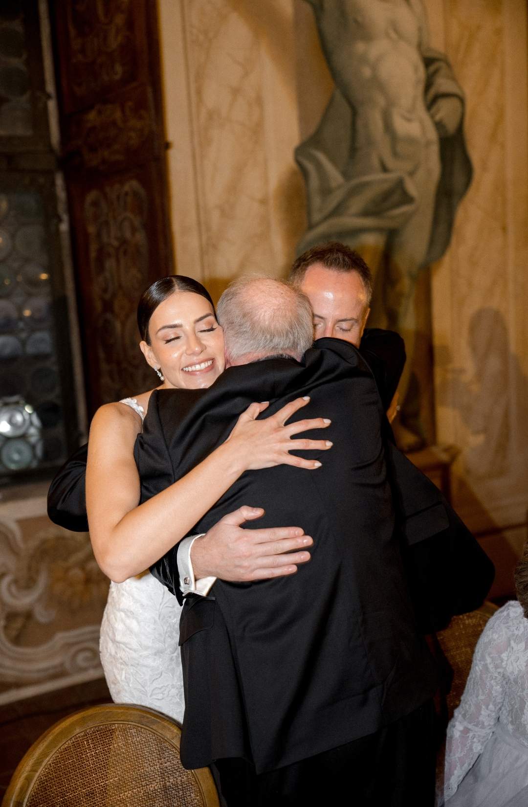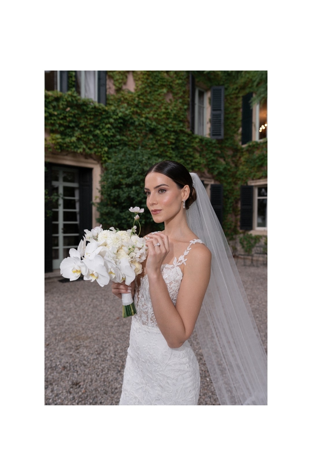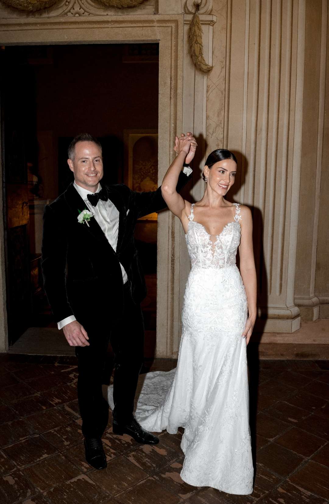 The couple, elegant yet effortlessly warm, moved through the day with a natural ease that made every moment feel intimate. From the bridal morning filled with laughter and silk robes, to the ceremony set against the villa’s monumental façade, everything felt sincere, never staged.
