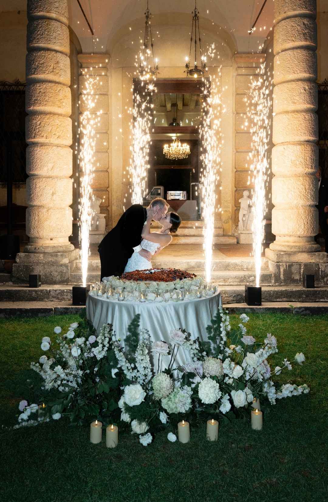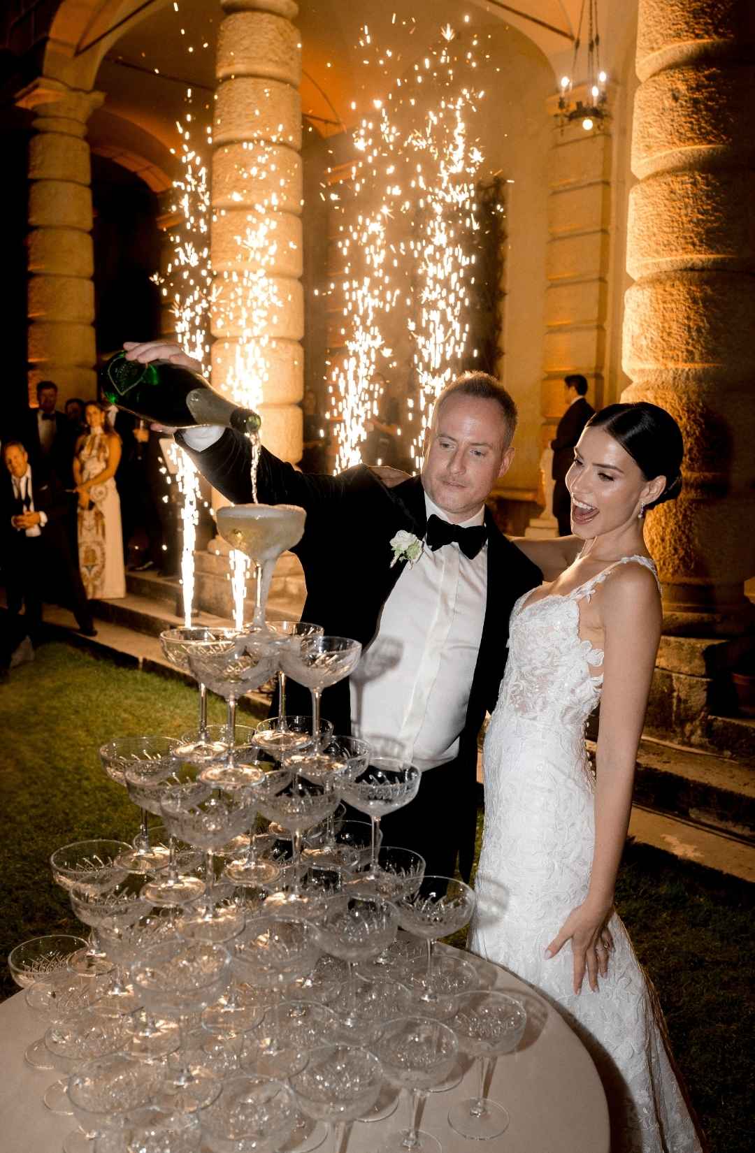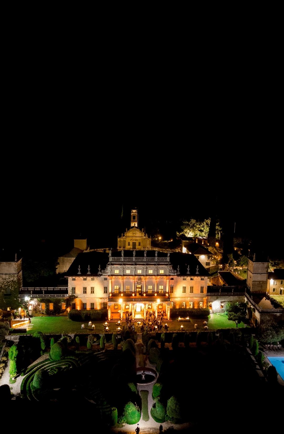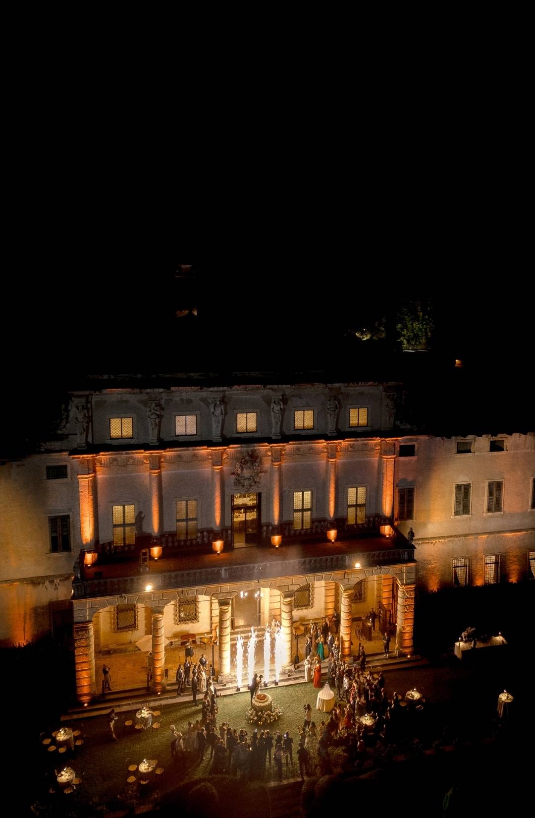 As evening fell, the villa illuminated in warm golden light. The façade glowed against the dark sky, and guests gathered in the courtyard as fireworks lit the night. It felt timeless. Iconic. Unmistakably Italian.