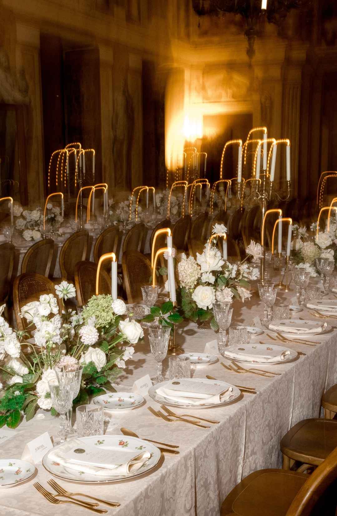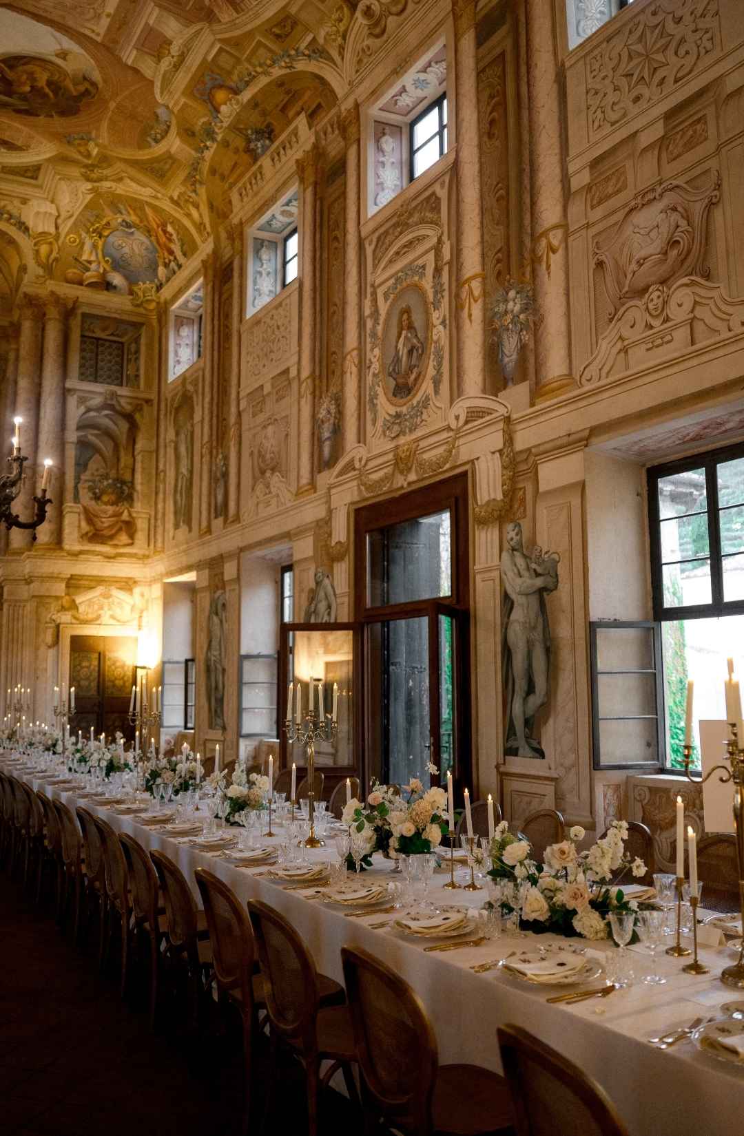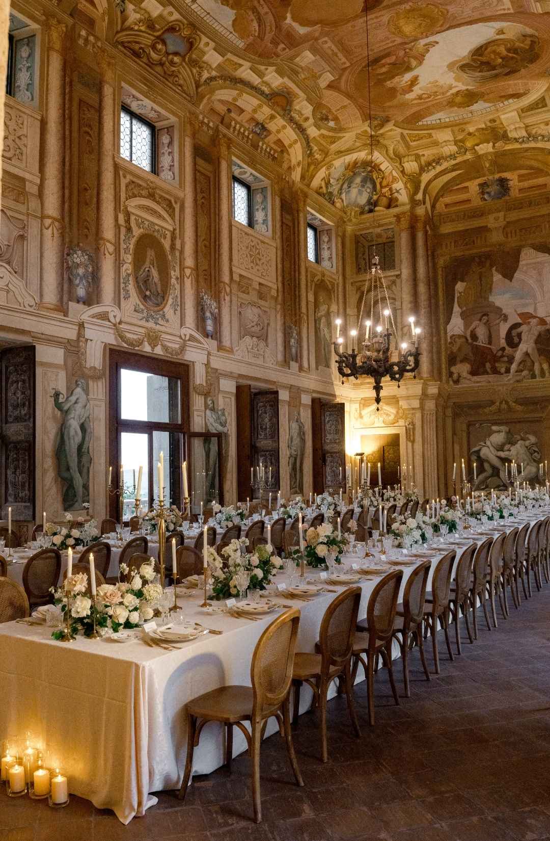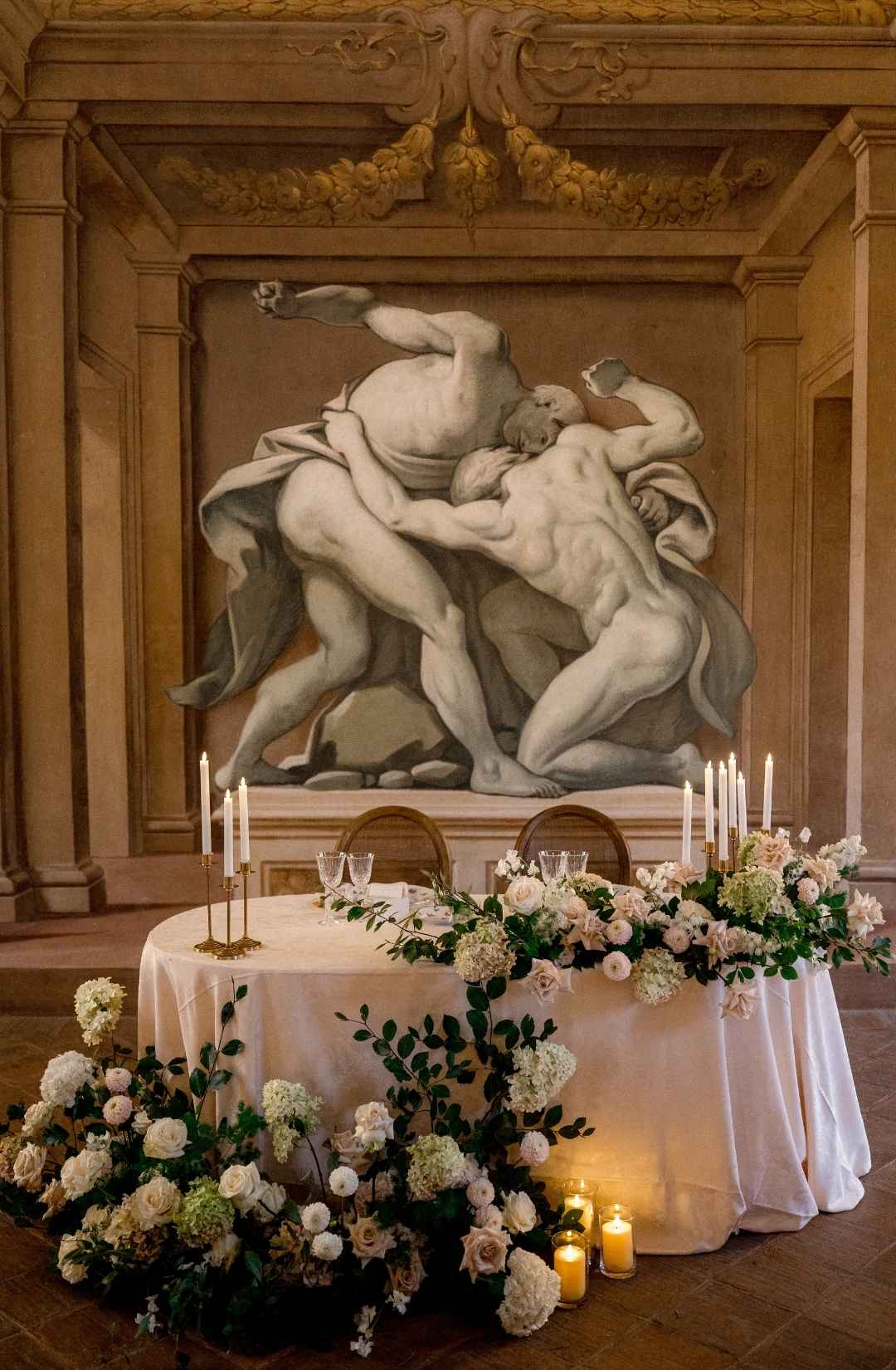 Long tables dressed in ivory linens stretched beneath the frescoed ceilings. Gold candlesticks flickered against painted mythological scenes. Sculptural floral compositions in soft blush and cream tones grounded the space in romance while allowing the architecture to remain the protagonist.