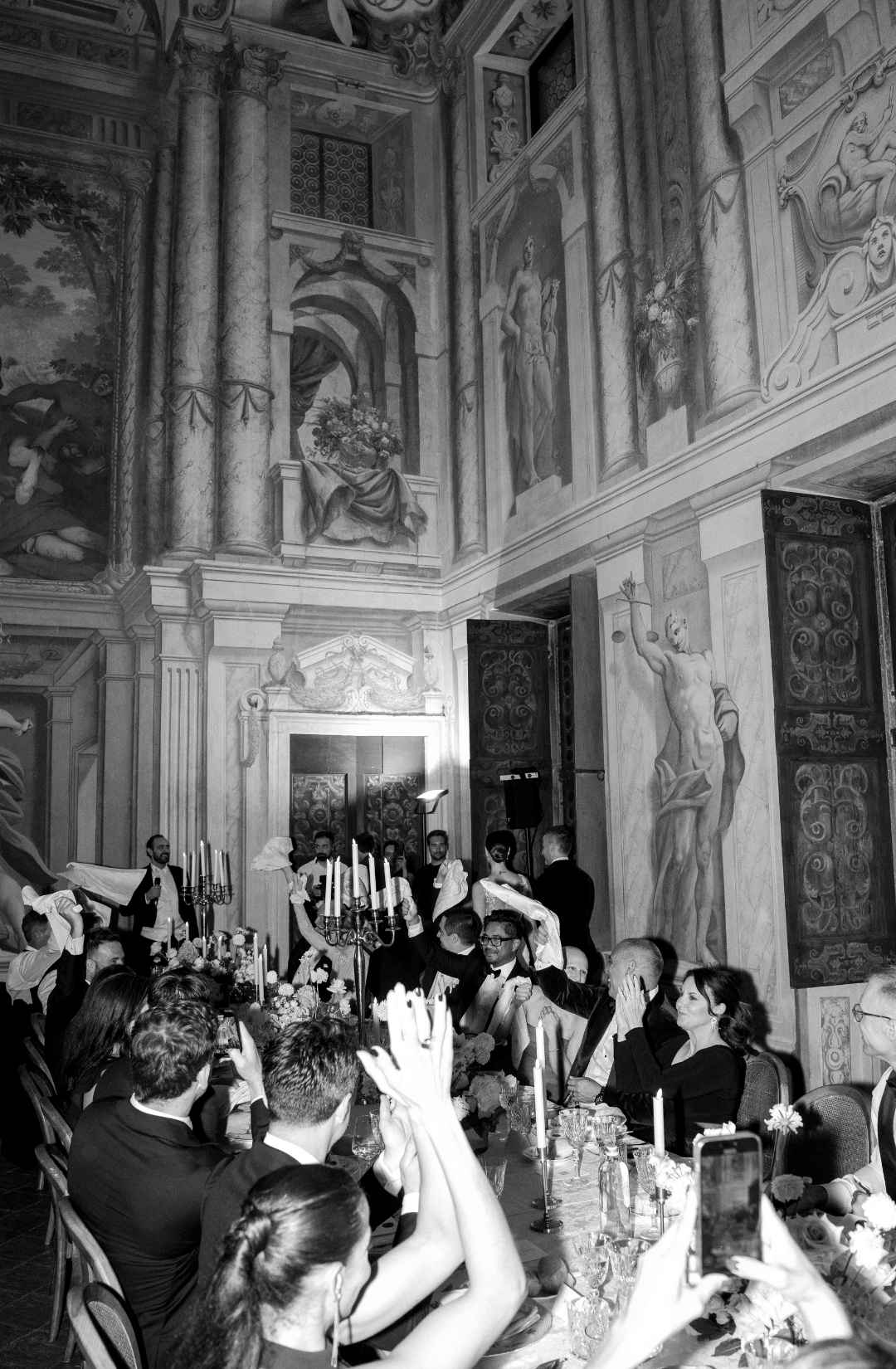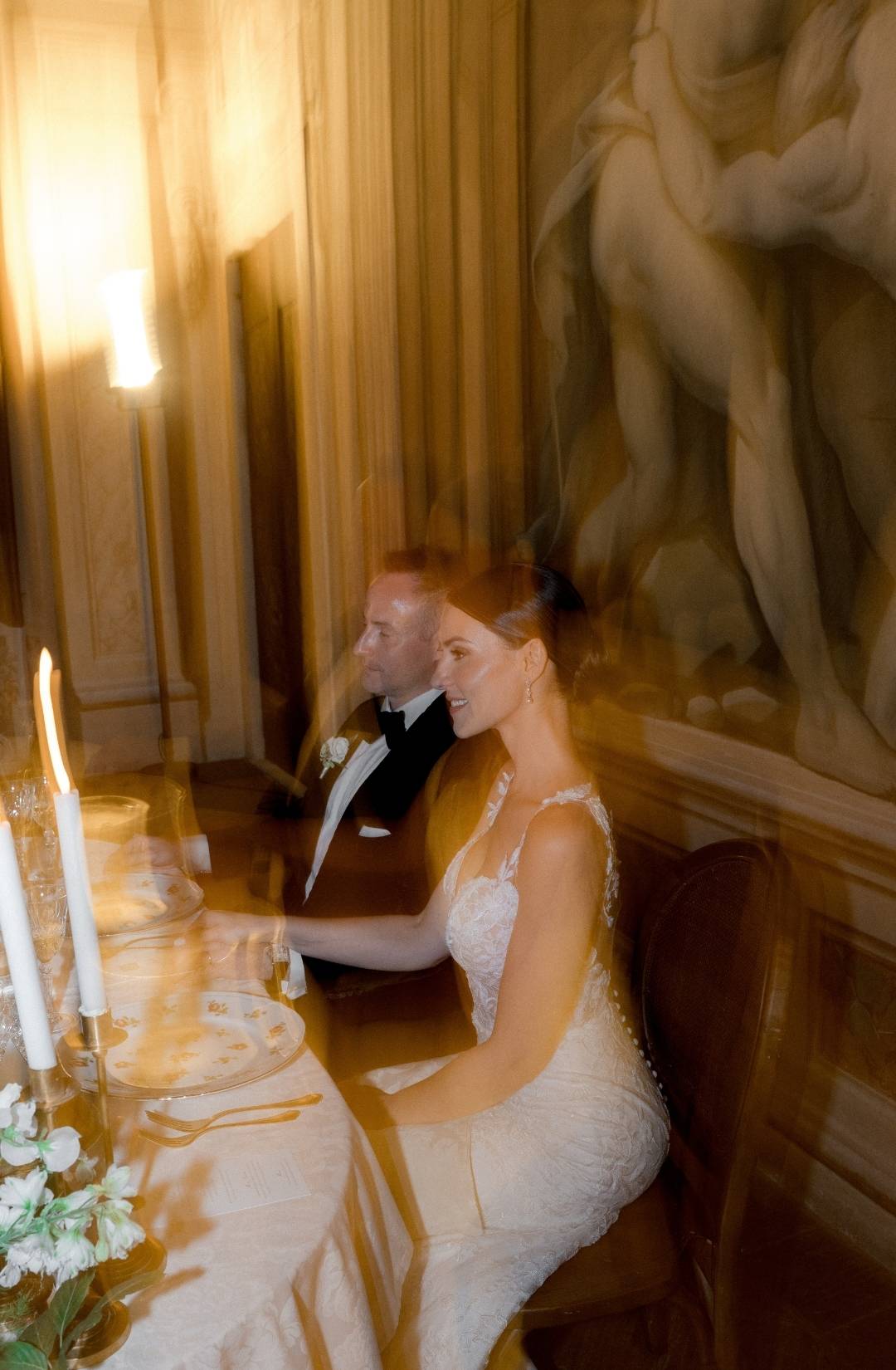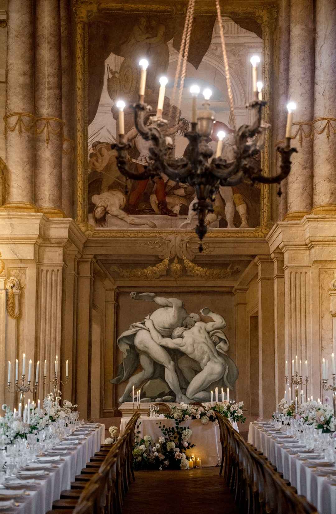 Long tables dressed in ivory linens stretched beneath the frescoed ceilings. Gold candlesticks flickered against painted mythological scenes. Sculptural floral compositions in soft blush and cream tones grounded the space in romance while allowing the architecture to remain the protagonist.