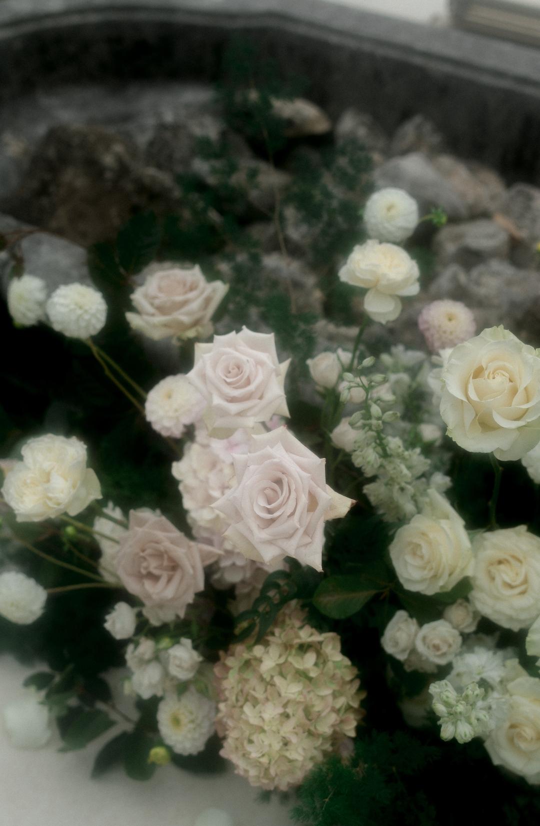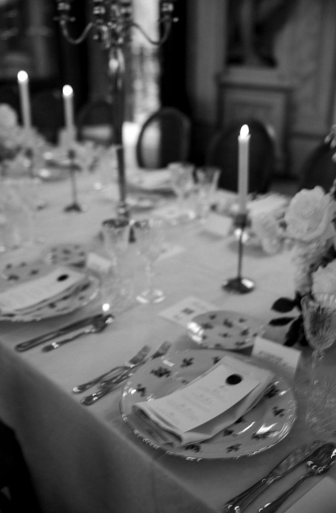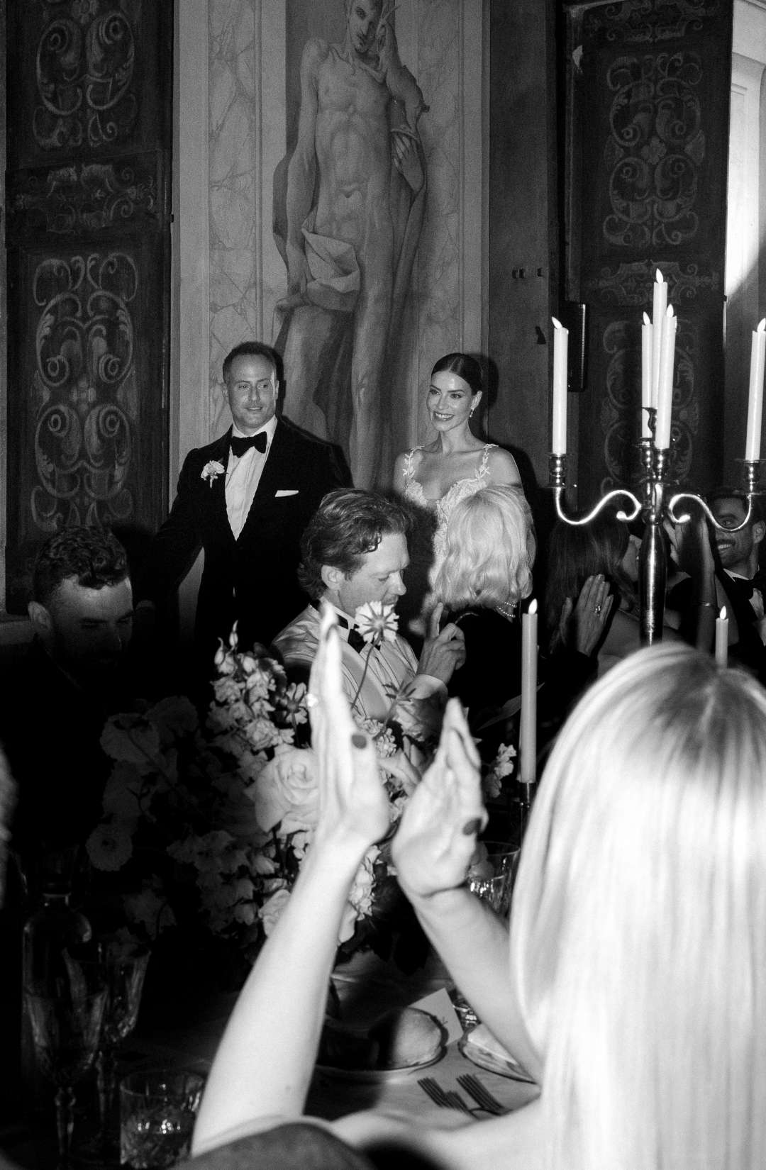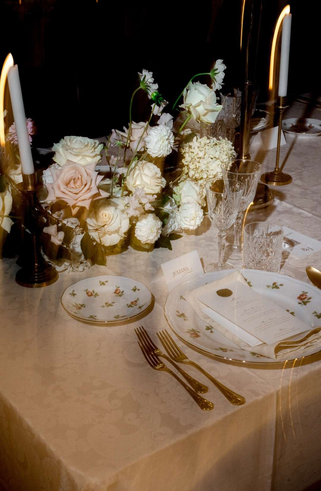 Long tables dressed in ivory linens stretched beneath the frescoed ceilings. Gold candlesticks flickered against painted mythological scenes. Sculptural floral compositions in soft blush and cream tones grounded the space in romance while allowing the architecture to remain the protagonist.