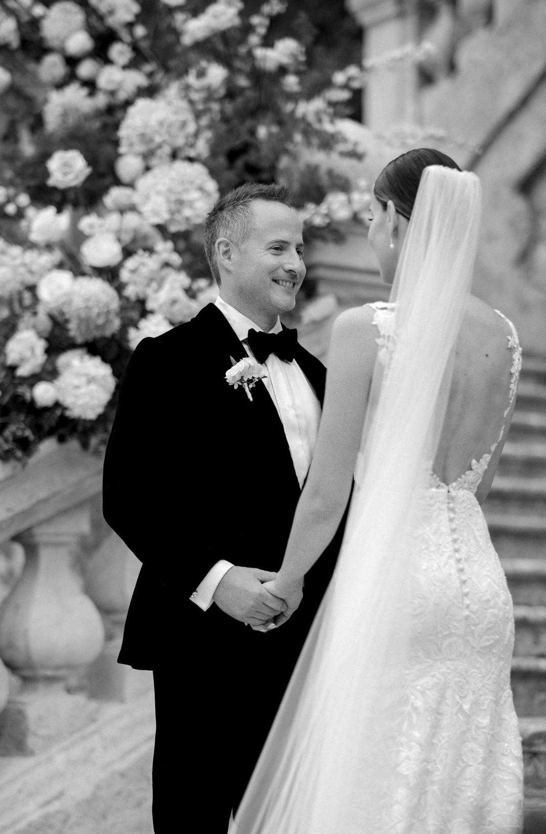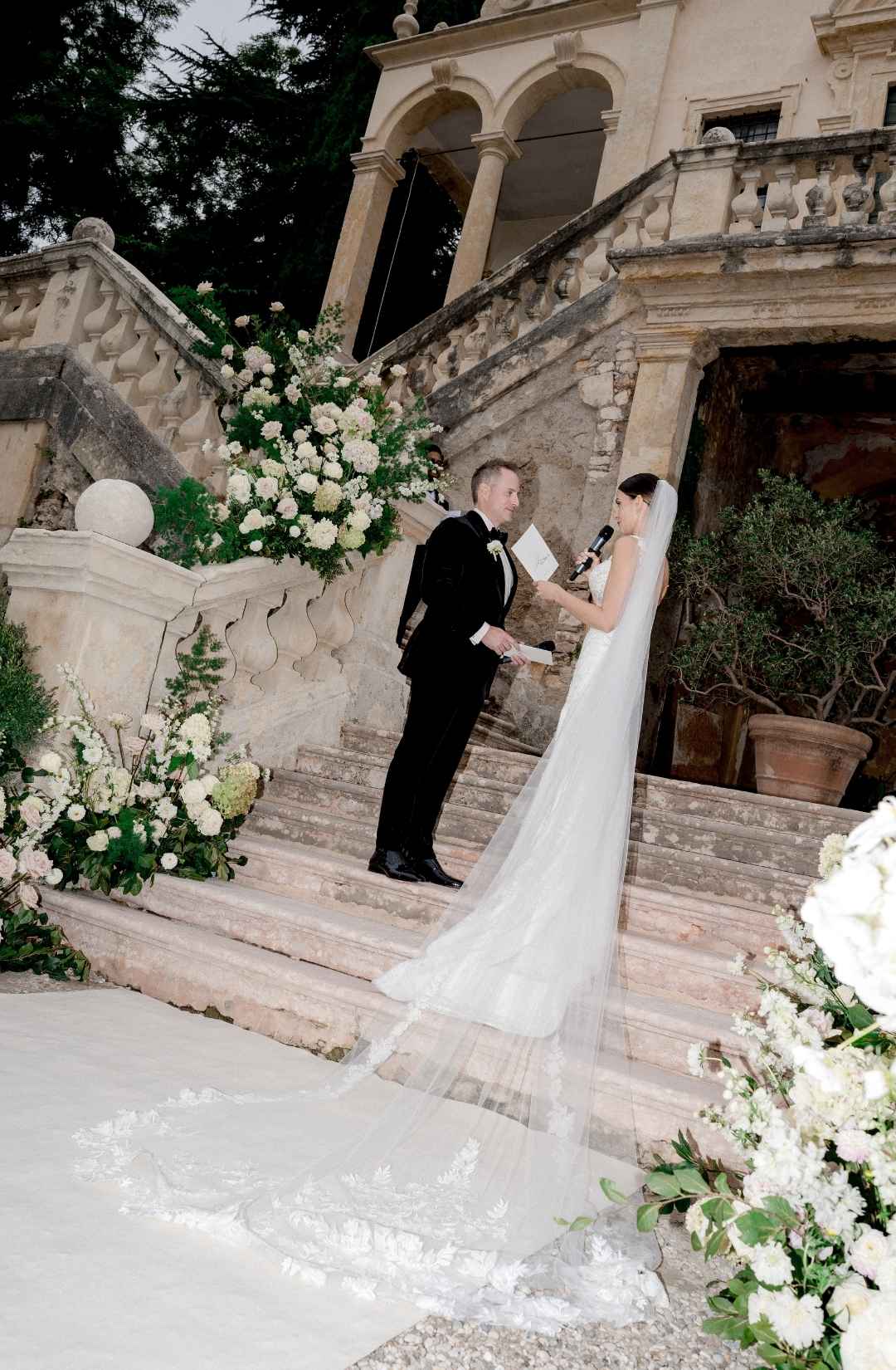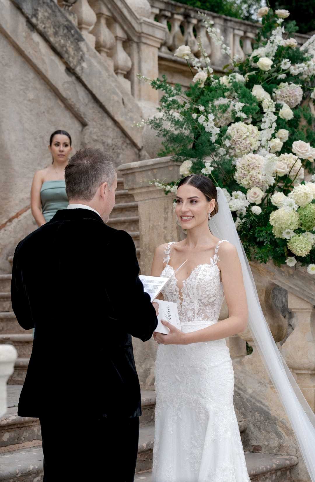 The ceremony unfolded on the grand staircase, framed by soft white florals that enhanced the villa’s classical architecture without overpowering it. The symmetry of the stone steps, the quiet greenery, the pale tones of the arrangements, all worked together to create a refined Italian villa wedding aesthetic.